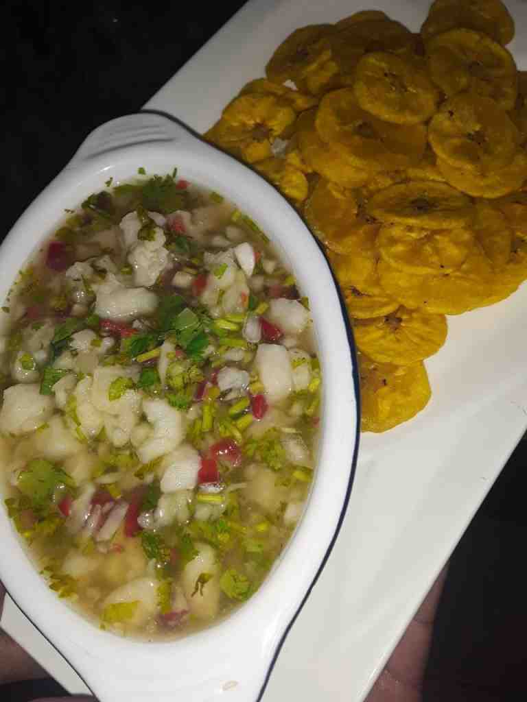 Como ingredientes utiliza: Filet de corvina, cebolla, chile dulce y culantro, ginger ale, sal, y una pizca de ajinomoto. Todo lo consigue en el comercio local, en cuanto el pescado prefiere comprarlo directamente en una pescadería porque se lo dan ya limpio y bien fileteado.