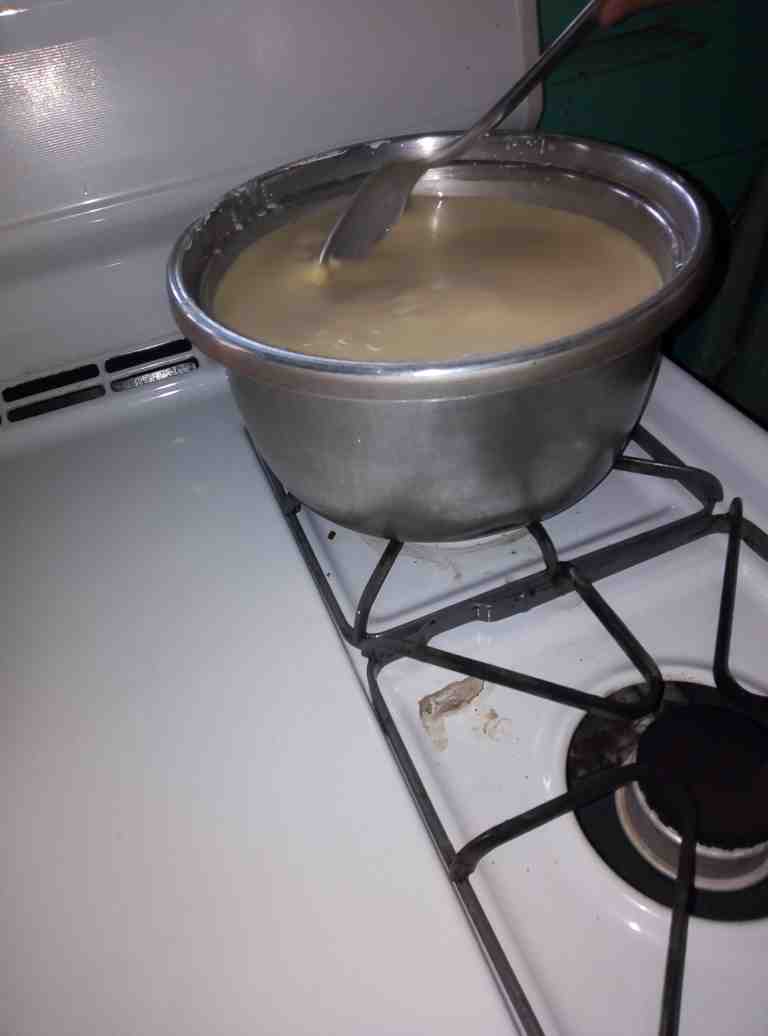 - Pasadas las 24 horas, se cuela el maíz y se pone a hervir a fuego lento, agregando el dulce (para obtener el color café) y azúcar. Se debe mezclar constantemente hasta que hierva.