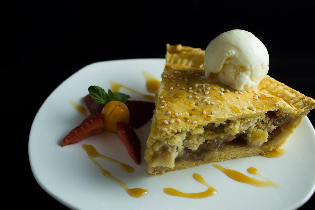 - Para presentar, se sirve caliente, acompañado con helado de vainilla, y se decora con fresas, uchuvas, hierbabuena y un poco de caramelo, en un plato de cerámica/porcelana o vidrio.