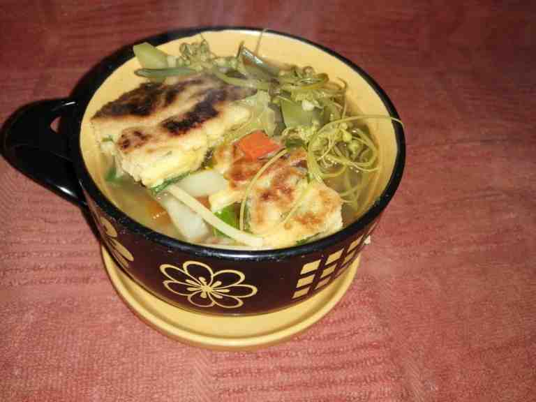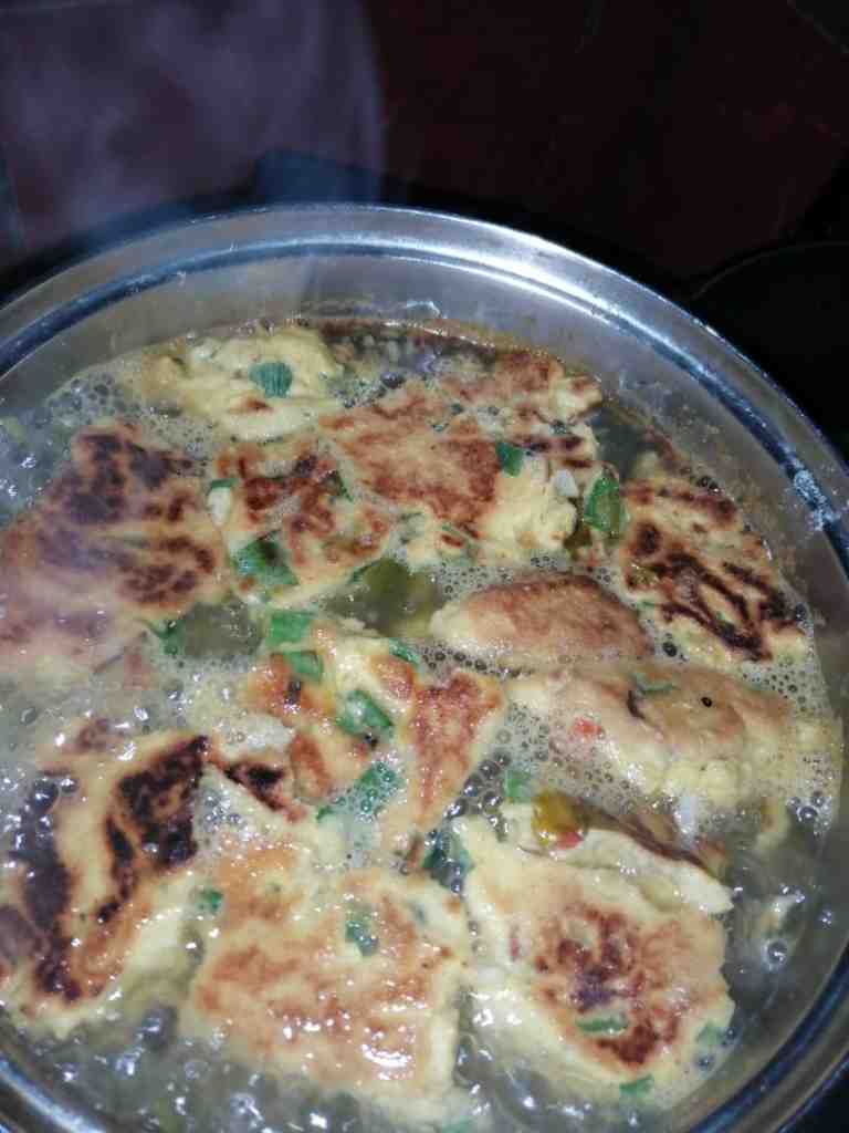 - Continuando con la sopa, cuando las verduras están cocinadas, se corta la torta de huevo en trozos, y se le agrega a la sopa, por último, se deja hervir por un minuto más y se rectifica la sal.